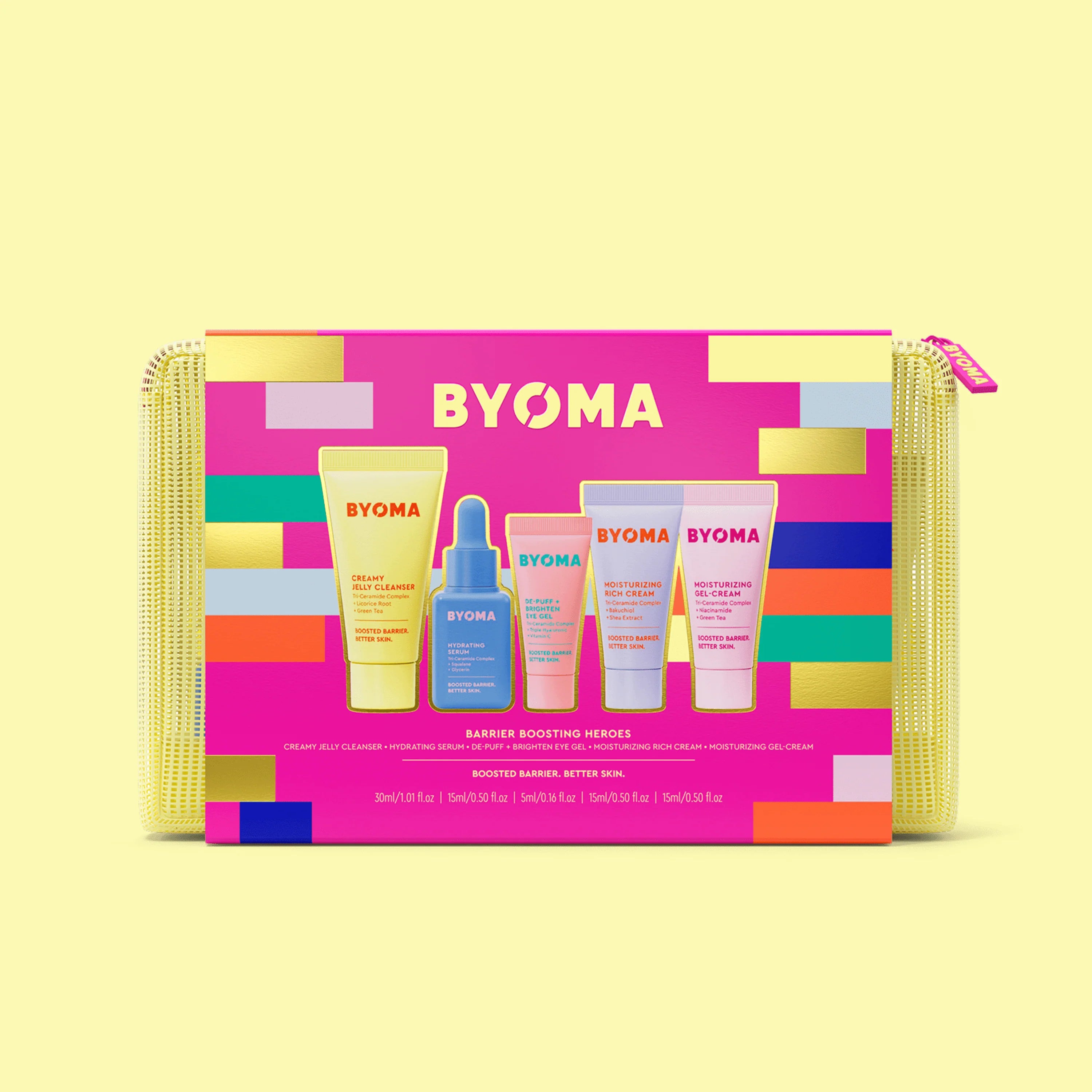 This gift comes packaged in a yellow mesh, Byoma zip pouch – perfect for on the go or storing your Byoma routine.