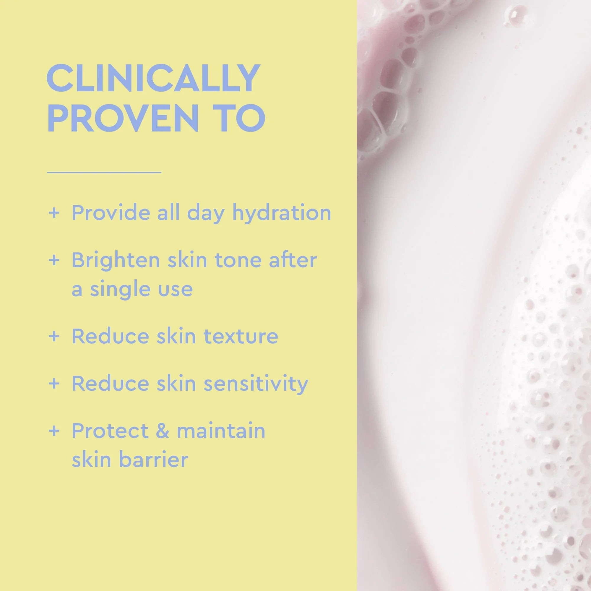 Clinically Proven To: – Provide all day hydration – Brighten skin tone after a single use – Protect and maintain skin barrier – Reduce skin texture – Reduce skin sensitivity